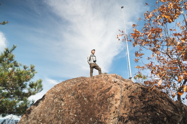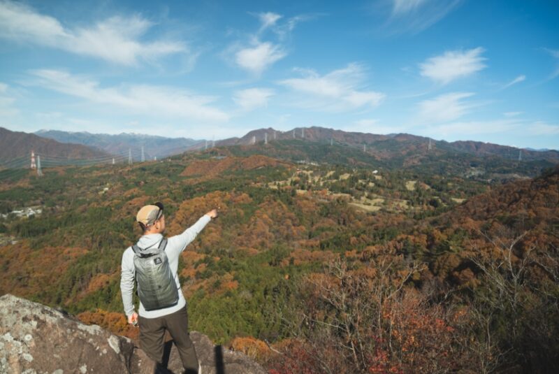 小天狗から尾根道を進み、中天狗、西国秩父観音群などを経由して、もうひとつの絶景ポイント・大天狗まではおよそ35分。ピークに向かう最後の登りは、鎖の設置されたスリル感ある岩場。手足をしっかりと使いながら、一歩ずつ進んだ先には、遮るもののない青空と絶景が待っています。往復20分の烏帽子岩を経由しても、2時間ほどで歩くことのできる嵩山。のんびりと1日かけて山に“ひたる”のもよし。ふもと温泉宿に泊まり、2日目の朝から歩く山としてもおすすめです。