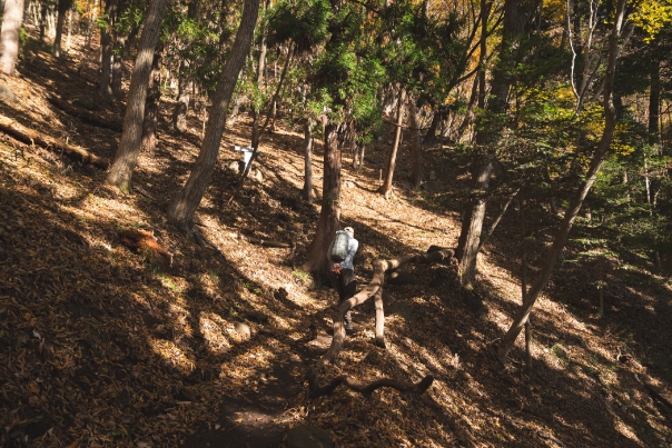 る広葉樹が入り混じる、つづら折りの樹林帯の道が続いていきます。山内には、